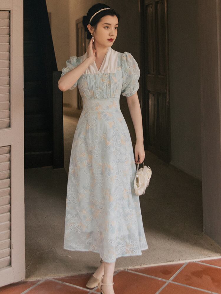 色:スクエアネックウォーターブルーフローラルスカート,Vネックウォーターブルーフローラルスカート