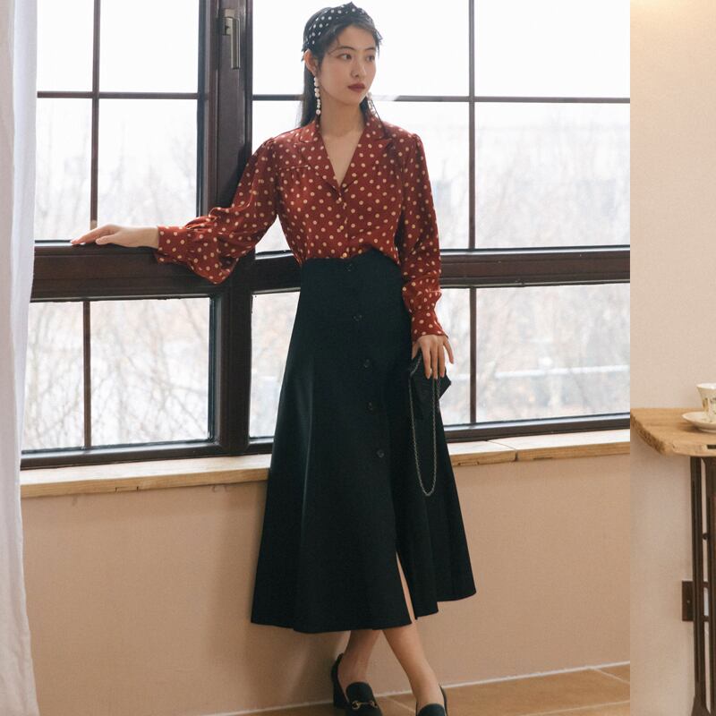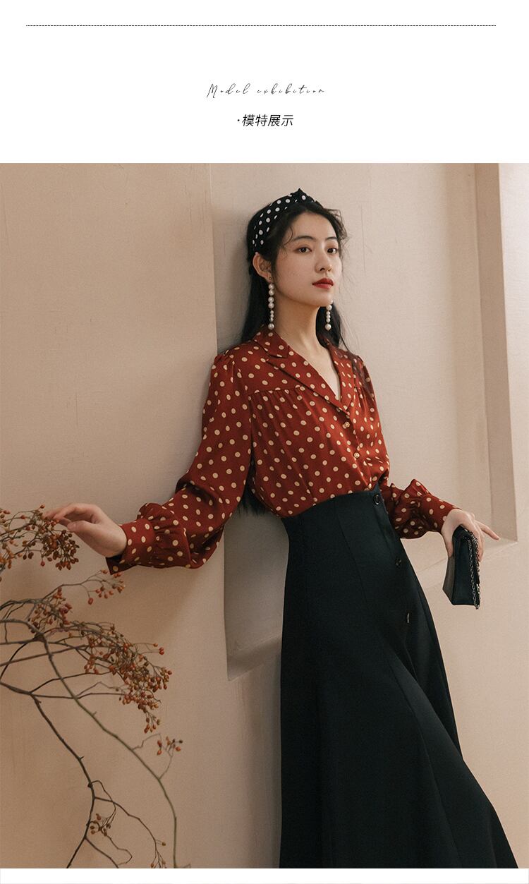 色:長袖のバーガンディ水玉ブラウス+Aラインスカートコレクションを購読して胸を包む,半袖バーガンディ水玉ブラウス+Aラインスカートコレクションを購読して胸を包む