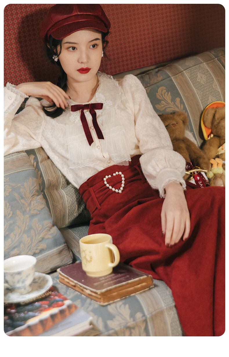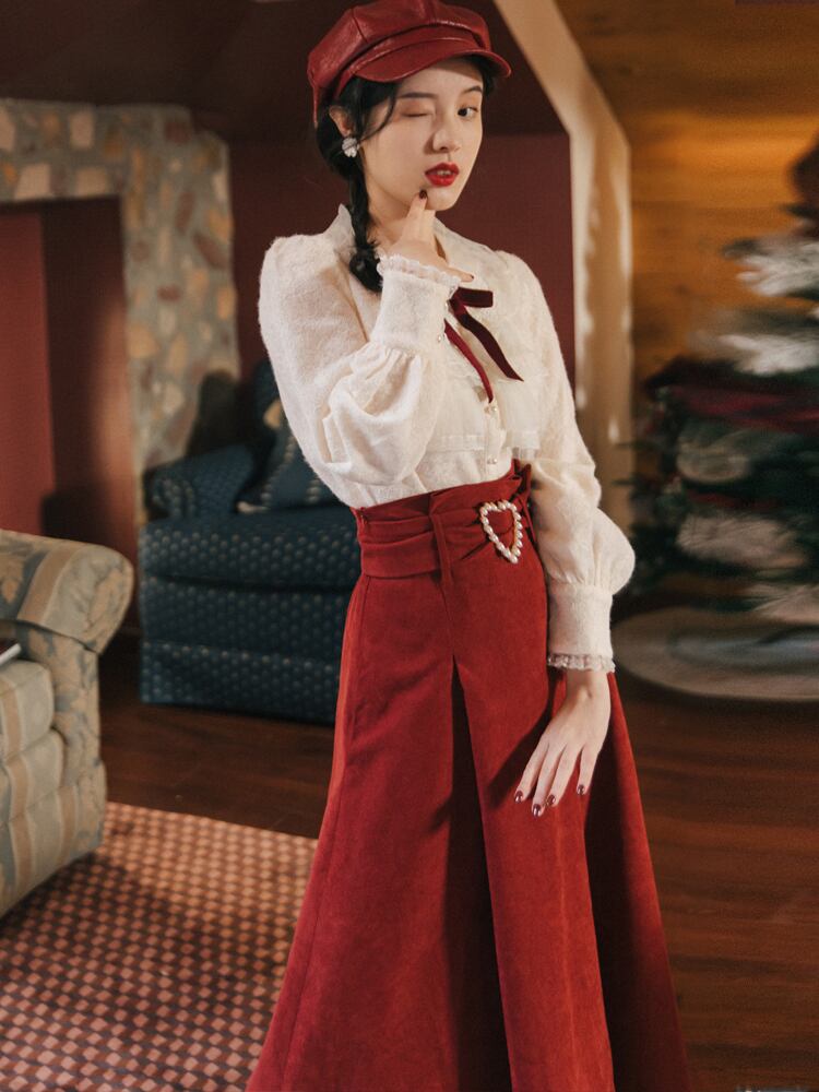 色:アプリコットトップ,赤いスカート,アプリコットトップ+赤いスカート