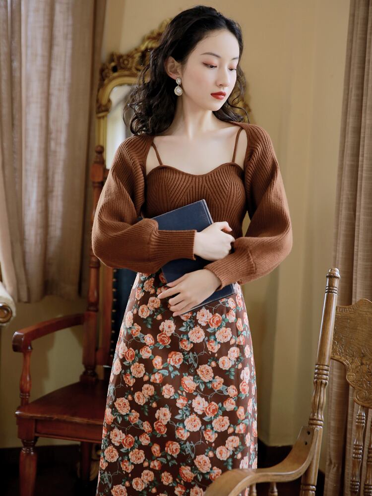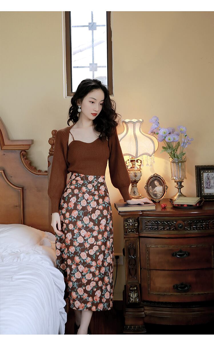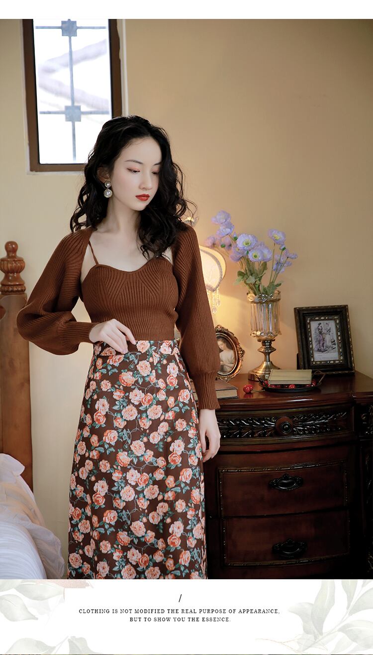 色:ブラウンのセーター+フローラルスカート